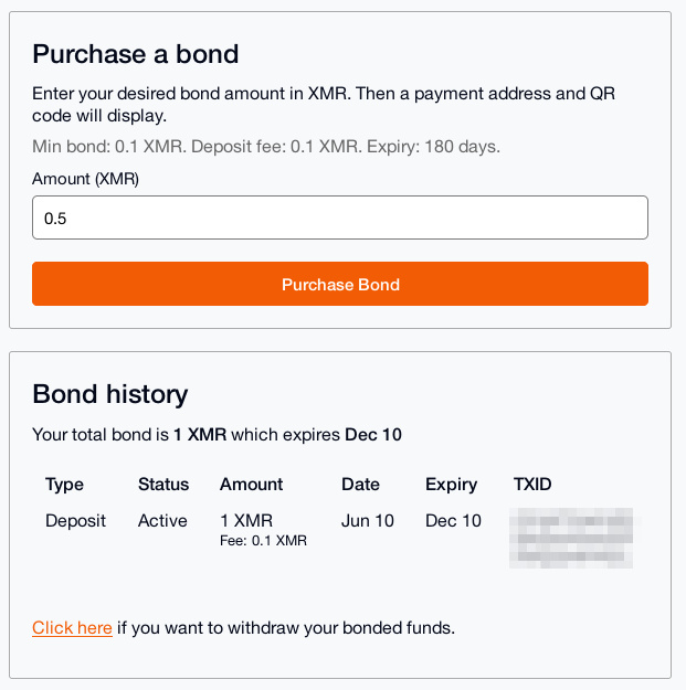 After clicking on a bond holder, the seller can view the bond terms, purchase a bond with XMR, and view their purchased bonds