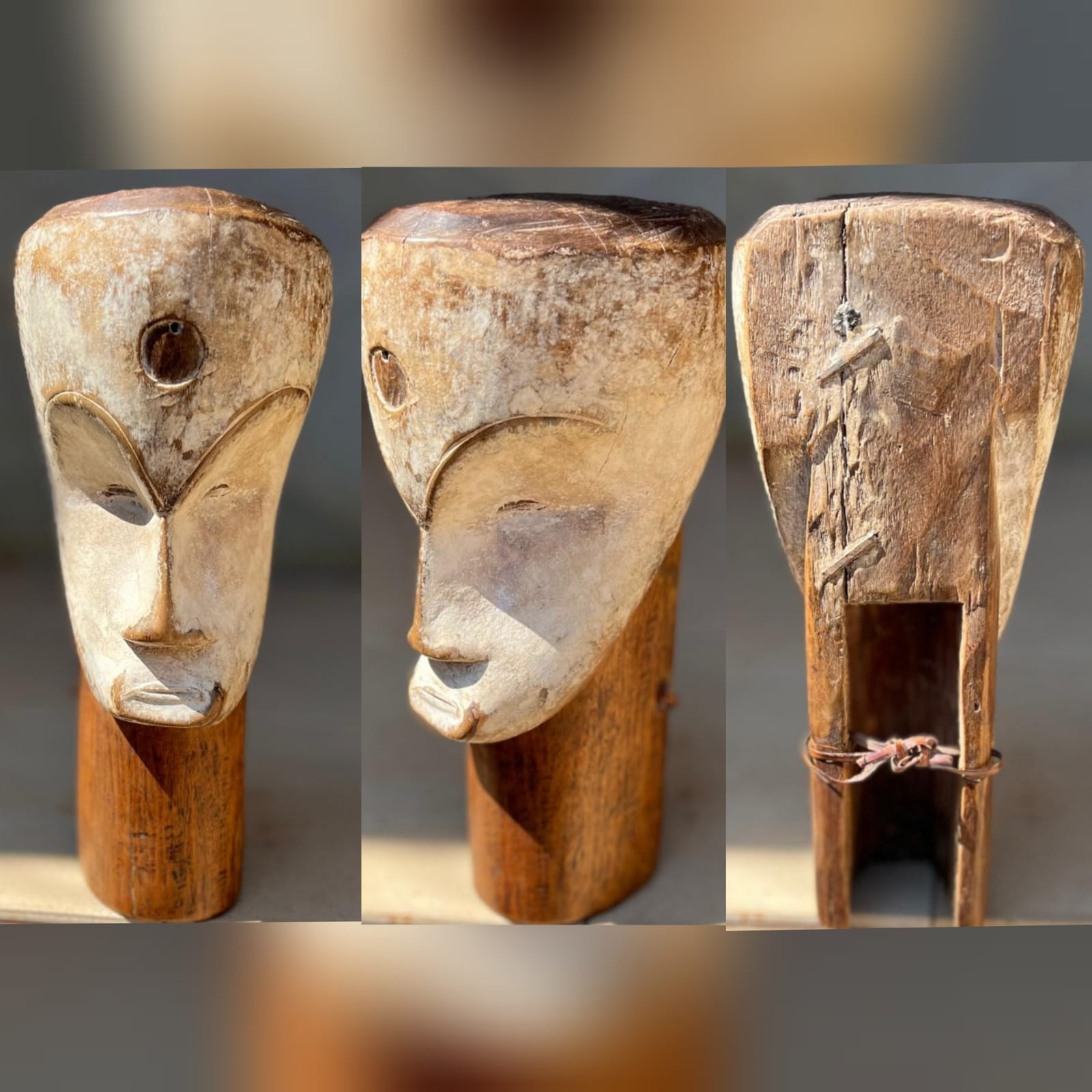 Note the sculptural quality displayed by the artist: the perfect balance of the face, curved like the famous Ngil masks, the white face reminiscent of the Bwiti initiations connecting with deceased ancestors, and the delicacy of the eyes, nose, and mouth, which are almost simply suggested. The stylistic choices found in this piece allow it to be attributed to the Fang Betsi subgroup.