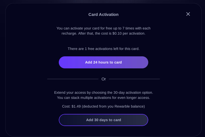 [3) When the active time expires (as now), you can re-activate the cards for 24 hours 7 times, for free. After that it costs 0.1$. Or 1.4$ for an entire month. ONLY 1 FREE ACTIVATION LEFT.