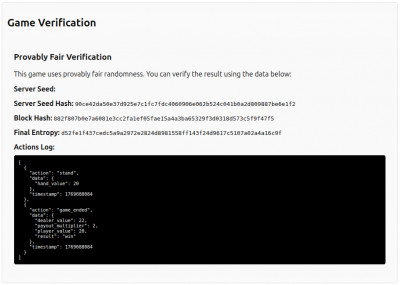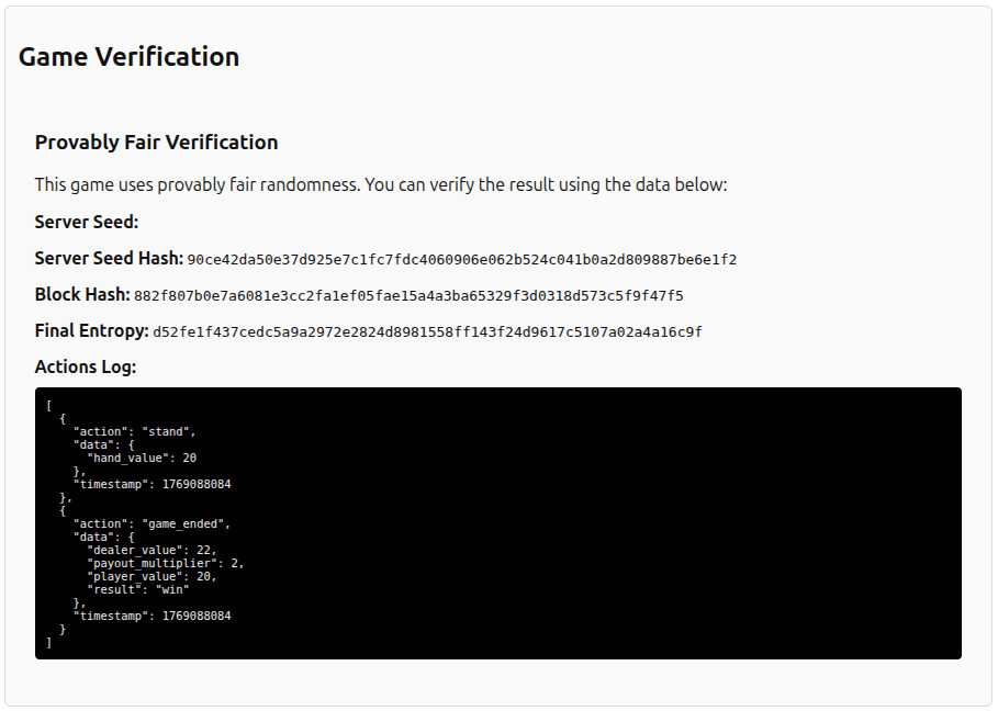 Play blackjack with Monero! Our provably fair system uses blockchain entropy to ensure transparent and verifiable gameplay.