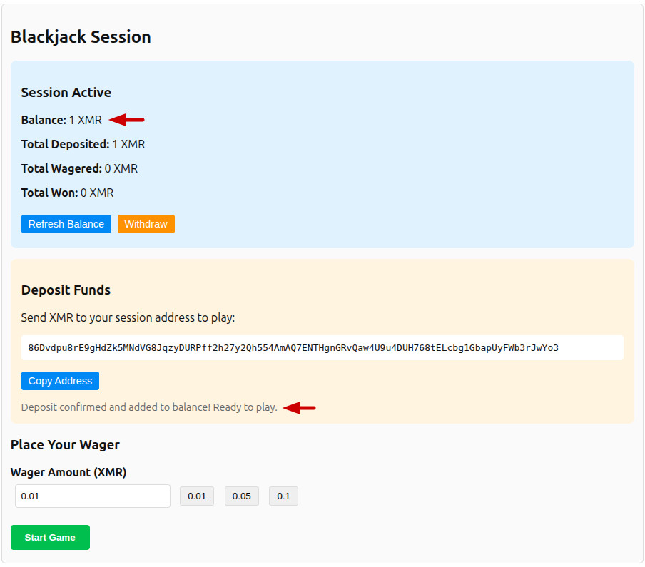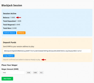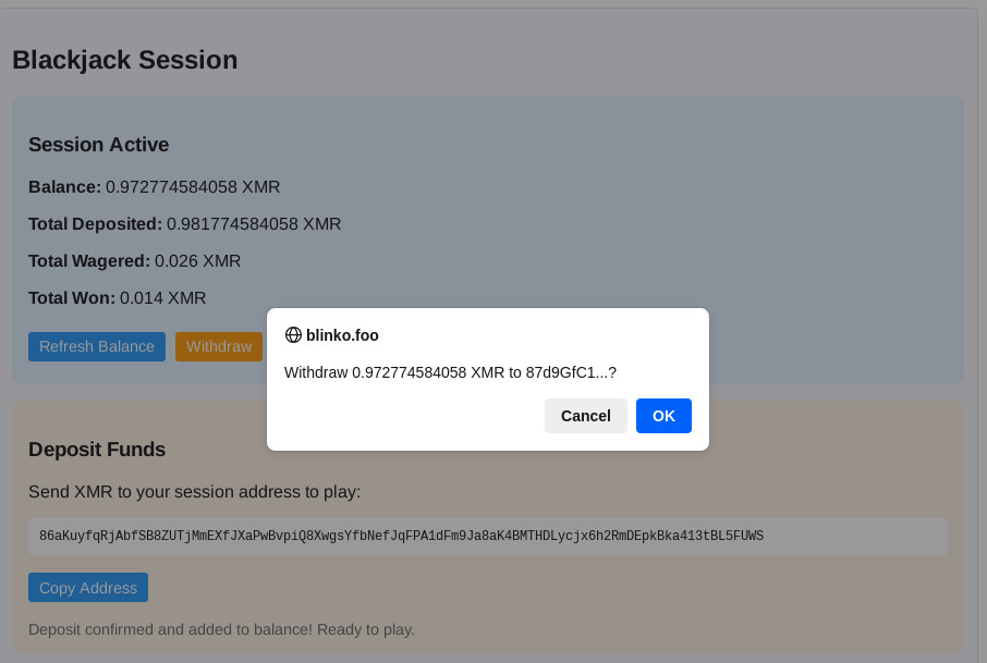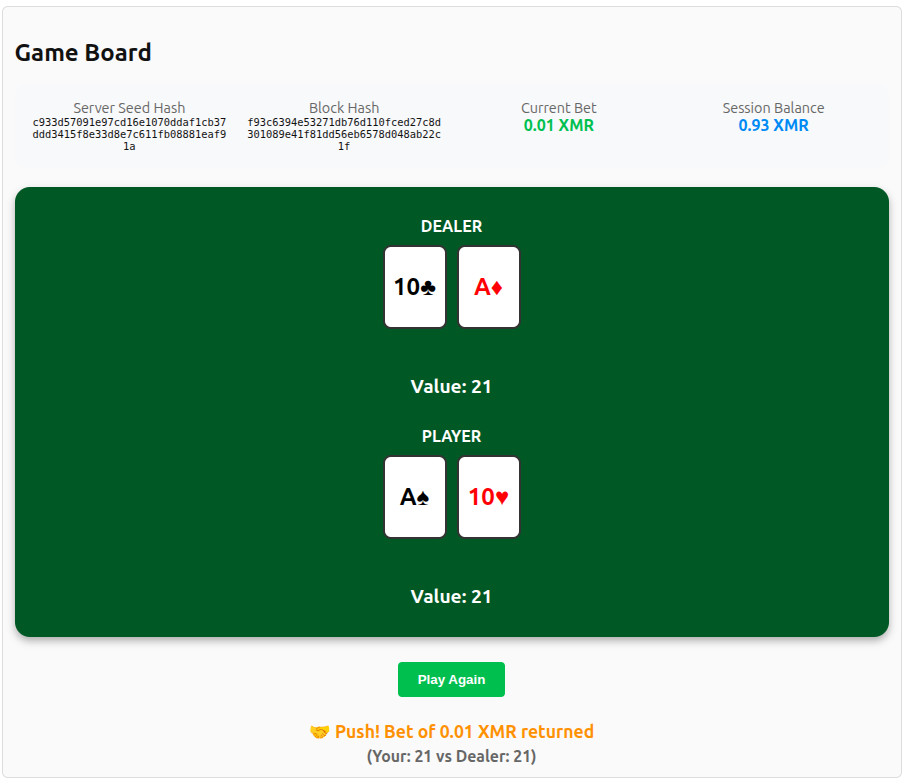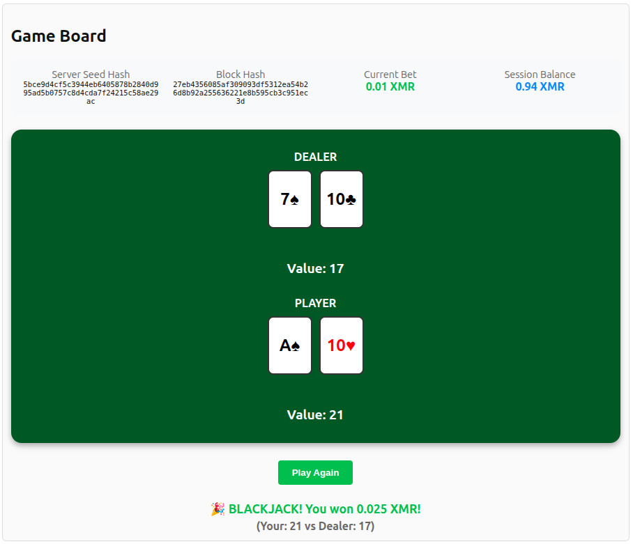 Provably Fair Monero Blackjack
