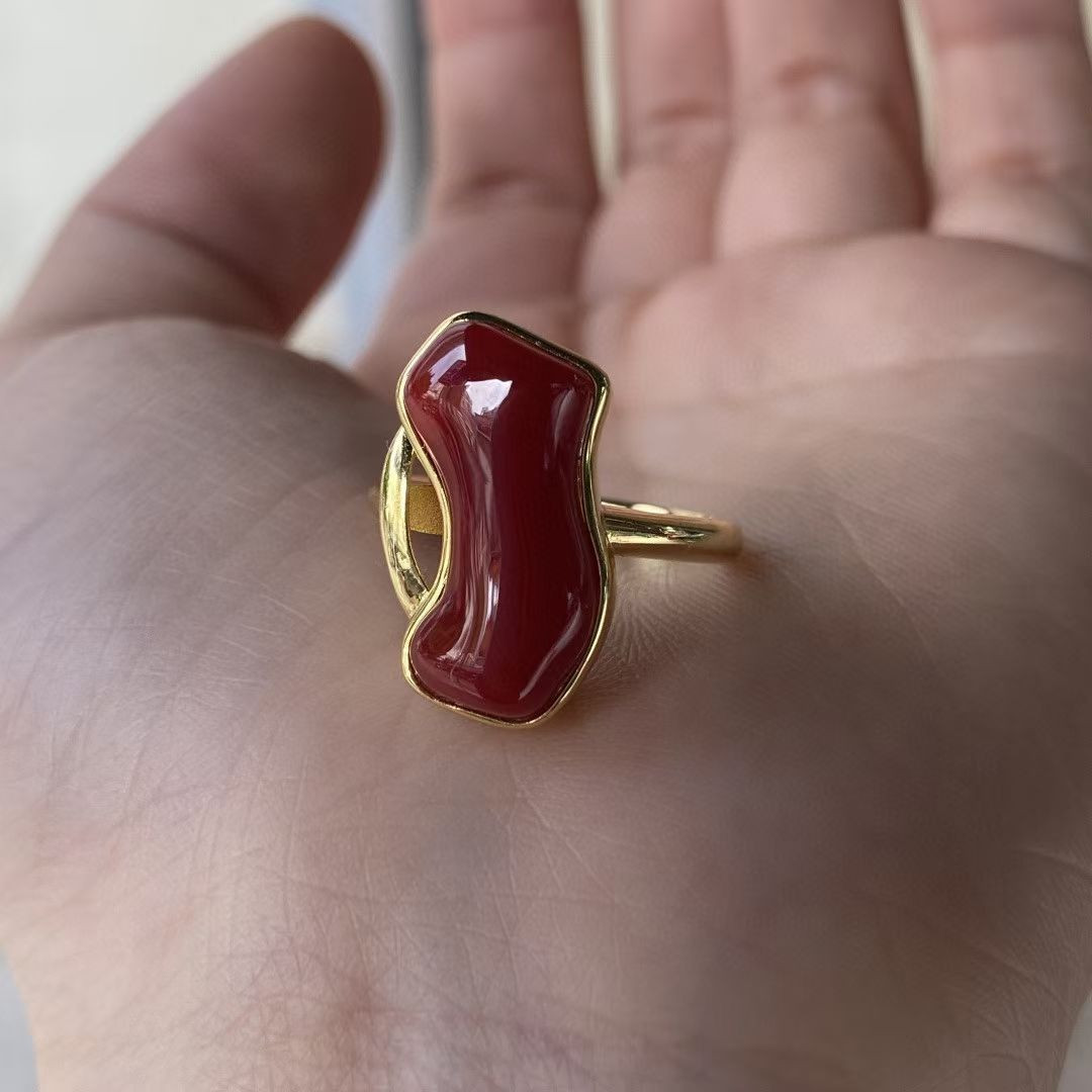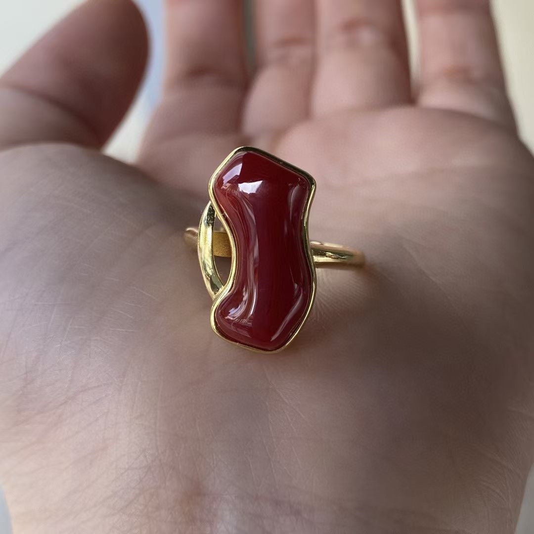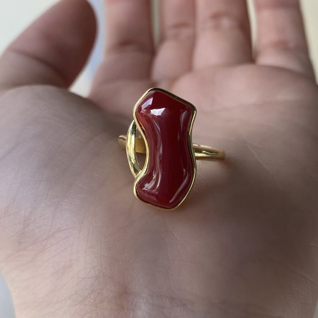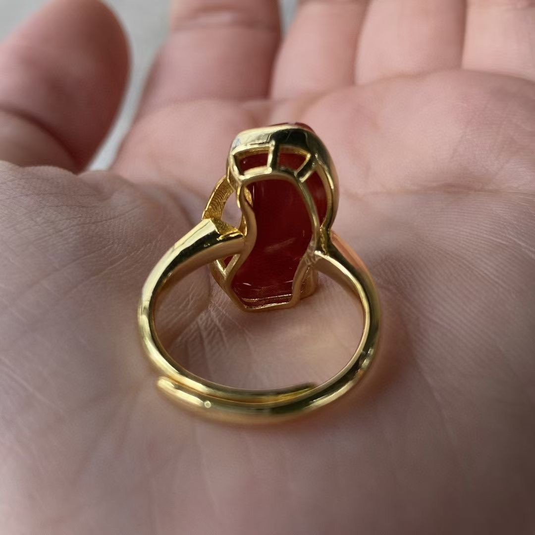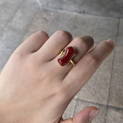 This Japanese Akoya red coral ring features a unique, irregular shape and a blood-red color, set in a 925 sterling silver band. Its quality and details are as exquisite as shown in the pictures. Dimensions: 11*19.5 mm, ring size 17 (adjustable).