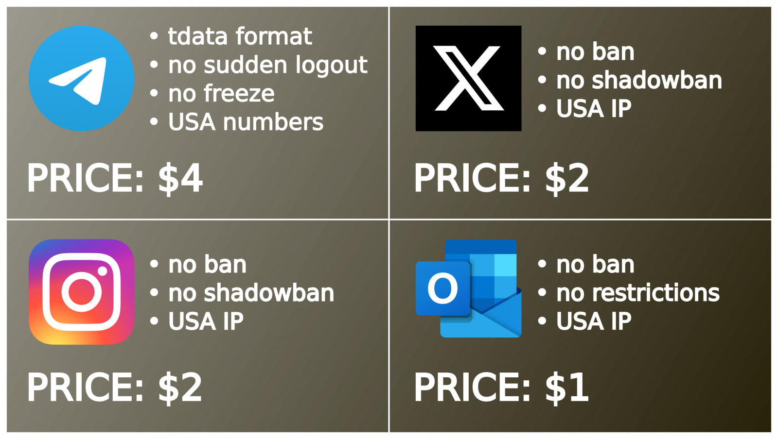 Tags: Telegram, X, Twitter, Instagram, Outlook, Account, Accounts