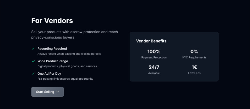 FOR VENDORS - Sell your products with escrow protection and reach privacy-conscious buyers