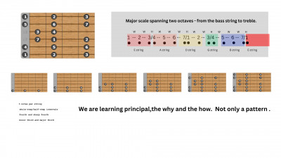 This guide consists of 3 parts and several videos, screencast + me with guitar showing the concepts. It takes you from learning to use the major scale with numbers 1-7, across all the strings. Then realizing there is only 5 shapes of chords and they relate to strings. All other chords are essentially modification of these. We learn that each shape consist from nucleus 5 1 3 and we learn to modify this nucleus to other chord types - major, minor, 7th. There is extra video on chord construction the conventional way and formula of harmonized major scale. Just for completion, but it is not essential to understand this to use the guitar syntax. Its just that if will ring the bell....then there is the final Guitar Syntax, the GPS which is how the name says, simple syntax, telling you what where to do, and you are in diatonic harmony. All the theory works in background, you utilize the fretboards nature to take advantage of it. The guide may seem nerdy....but its simple language...and its made for people who really want to unlock the fretboard. Its the AHA moment. Thank you for getting it from me and becoming pioneer of this revolutionary but simple thing.