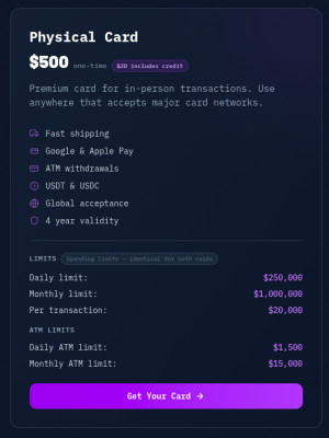 Bring your crypto into the real world with a powerful physical card built for global spending, privacy, and high limits.