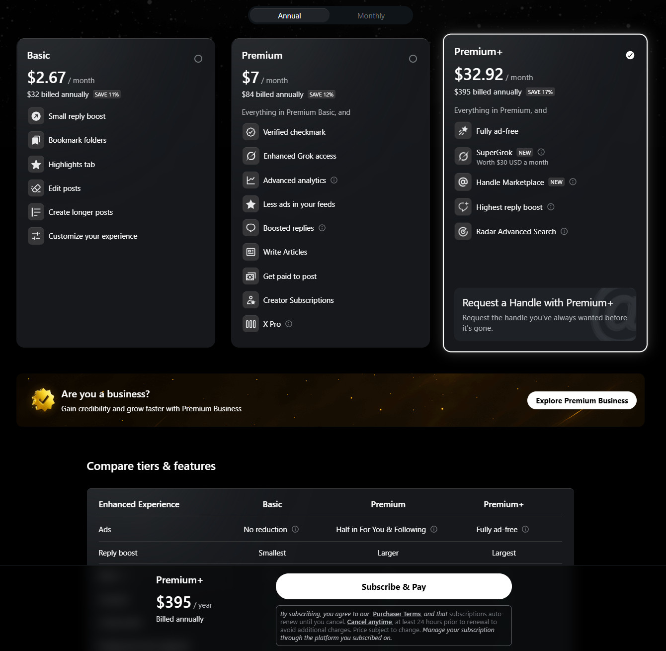 Premium: Includes all Basic features plus a checkmark, reduced ads, access to apply for creator revenue sharing and creator subscriptions, larger reply prioritization, ID verification, Media Studio, and increased usage limits on Grok.