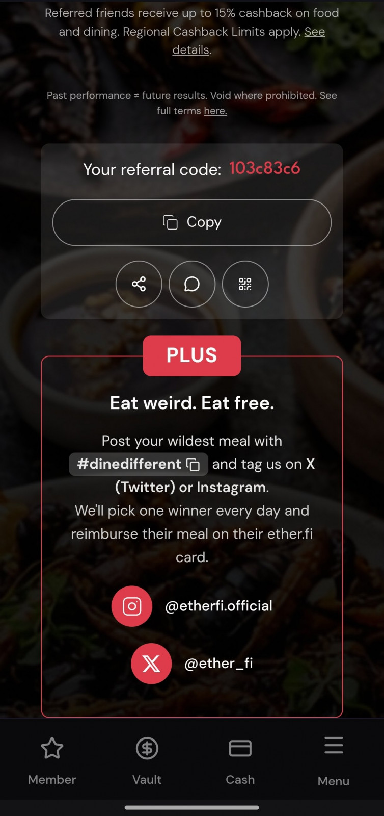 Get 15% back on food this month (4% on everything else) using this link Ether.fi: https://www.ether.fi/refer/103c83c6