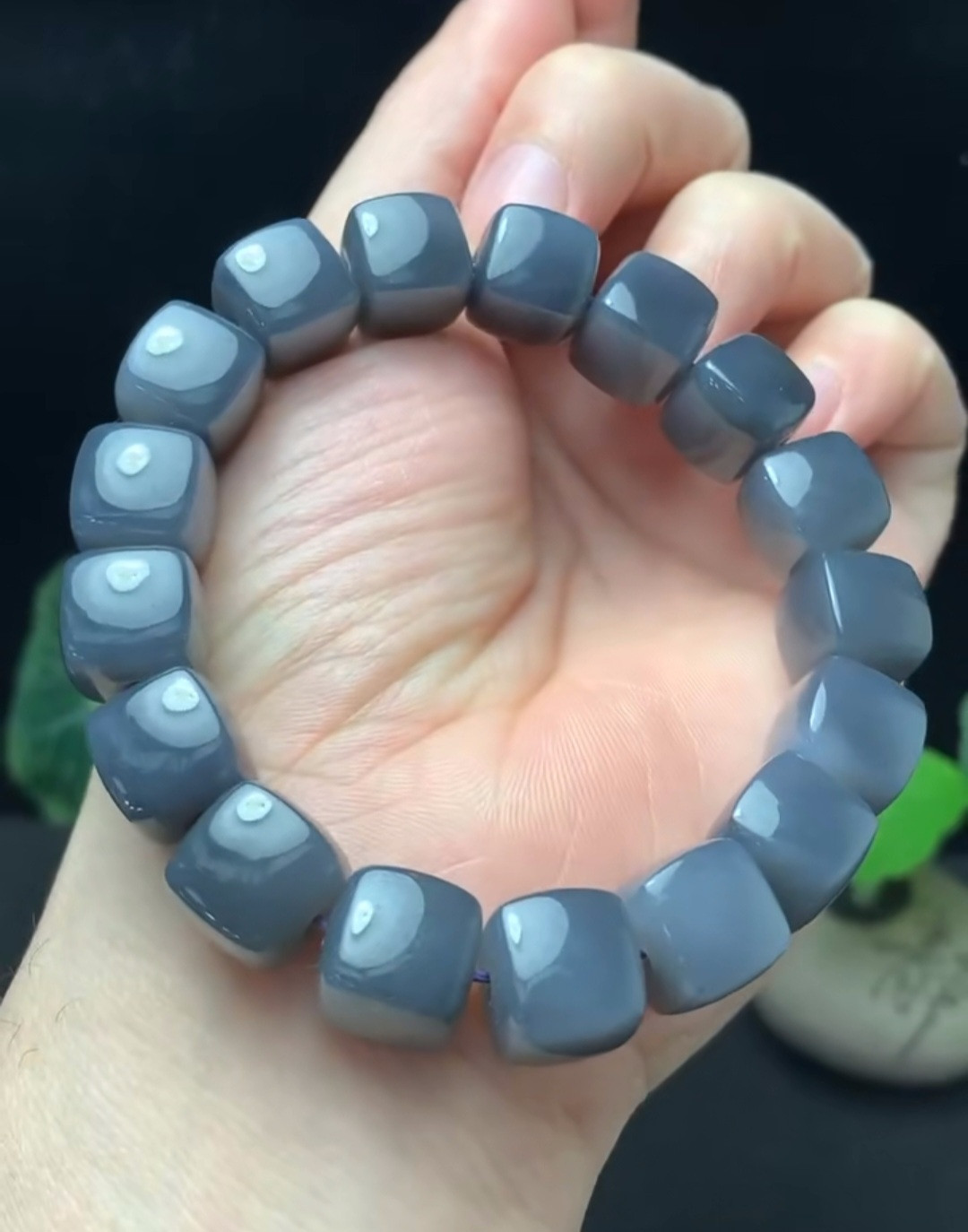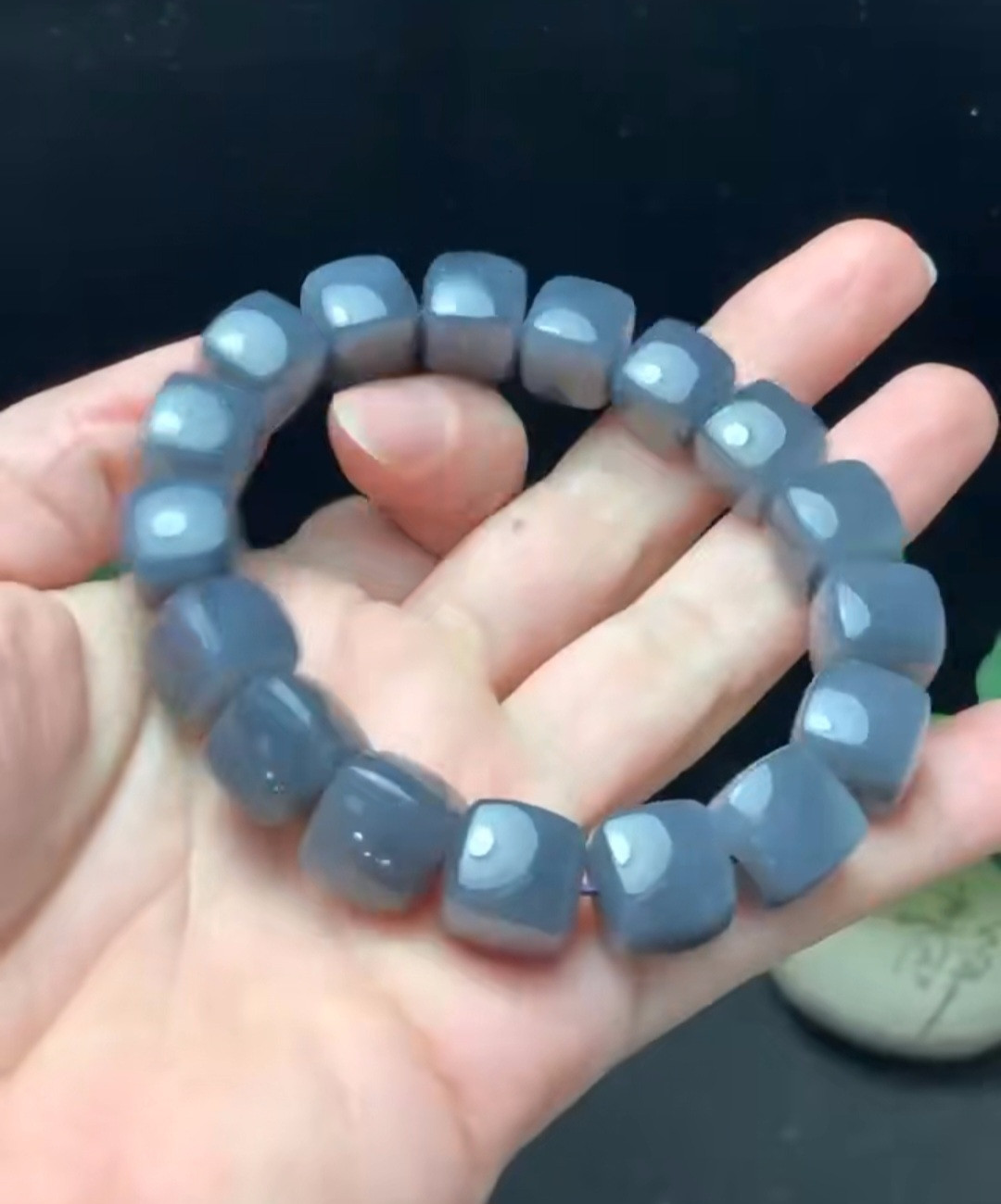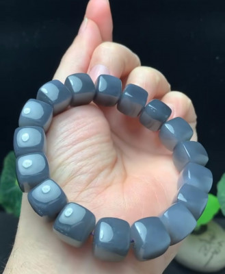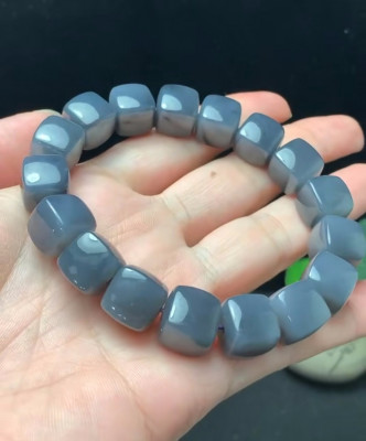 和田玉冰紫色方形手链,12×12毫米,17颗珠子,重64.3克。美丽的紫色,玉质细腻,油润透亮,含水量极佳。