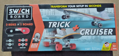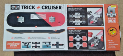 Brand New Sw/ch Swich Board, 2-in-1 complete kit skateboard for doing tricks and carving / cruising on the same deck. Comes with 2 sets of trucks and 2 sets of wheels for the 1 deck. The packaging has seen some damage (in the photos), but otherwise this is a brand new item.