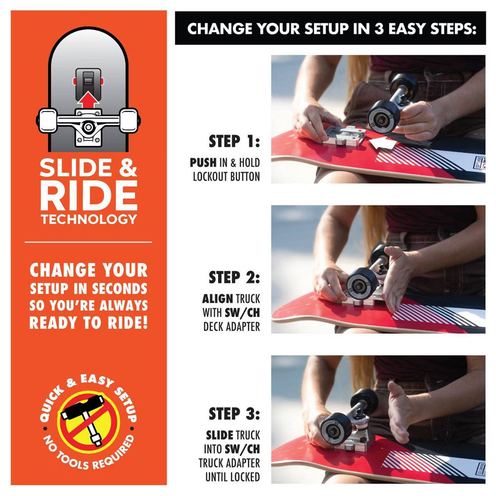 Introducing SW/CH BOARD, the only complete skateboard system with Slide & Ride technology that lets you change your setup in seconds—no tools needed!