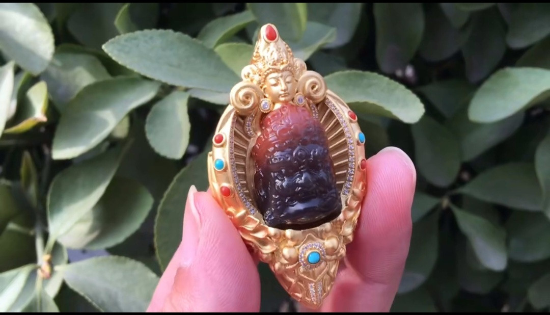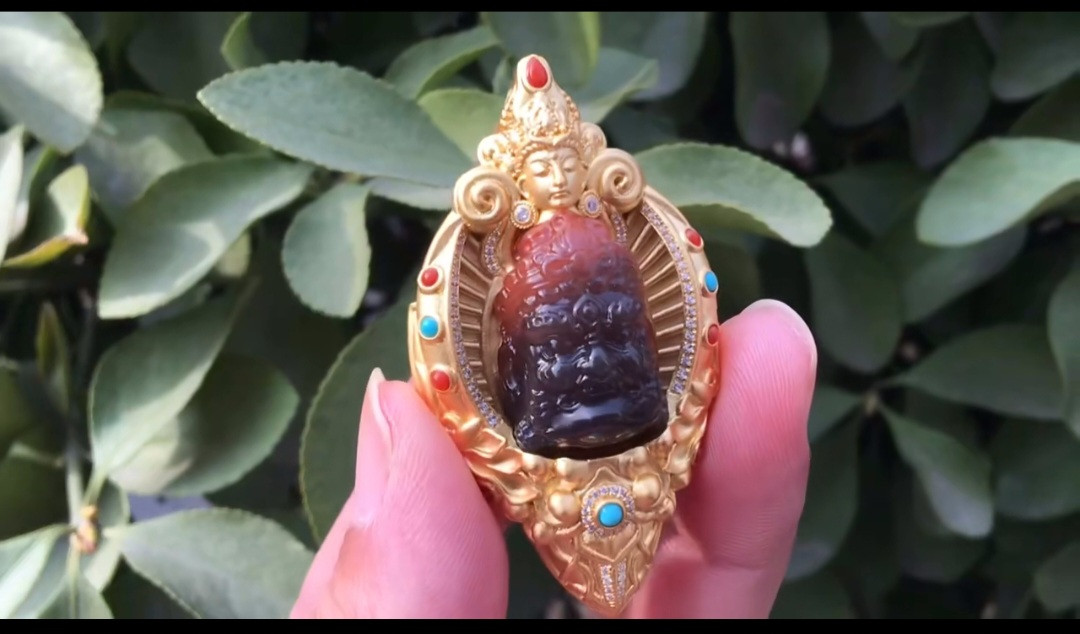 Mahakala (or Mahakala) is a beautiful piece of southern red agate, crafted from a mixture of black and red materials. It is set in striking 925 silver, is of perfect quality, and measures 58 x 33 x 20 mm, weighing 38 grams. Mahakala (Sanskrit: Mahākāla, Tibetan: Nag po chen po) is an important deity in South Asian Hinduism and Buddhism, one of the emanations of Shiva (the Great Exalted One), later absorbed as a protector deity in Buddhism, especially revered in Tibetan Buddhism. He is not only a wrathful protector who wards off evil and obstacles, but also a god of medicine and wealth who governs riches and food.