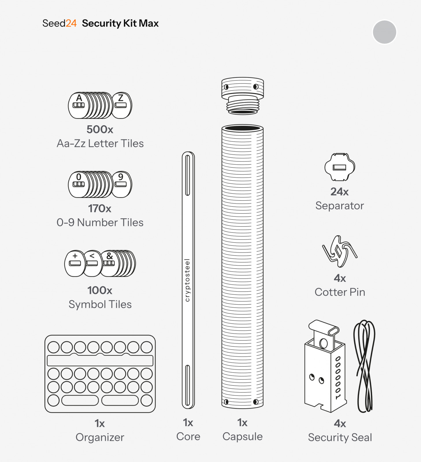 The Seed24 builds upon the original Cryptosteel Capsule's architecture, retaining all functionalities and introducing enhancements such as tamper-evident seals and a detachable core to increase security and user flexibility. It's waterproof, fireproof, and corrosion resistant, ensuring long-term durability. It supports the full ASCII character set, accommodating up to 128 characters for comprehensive storage of everything from passwords and seed phrases to complex configurations like multishare backups.