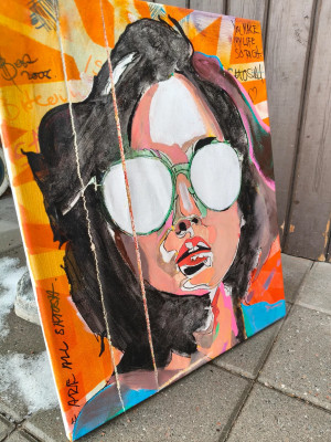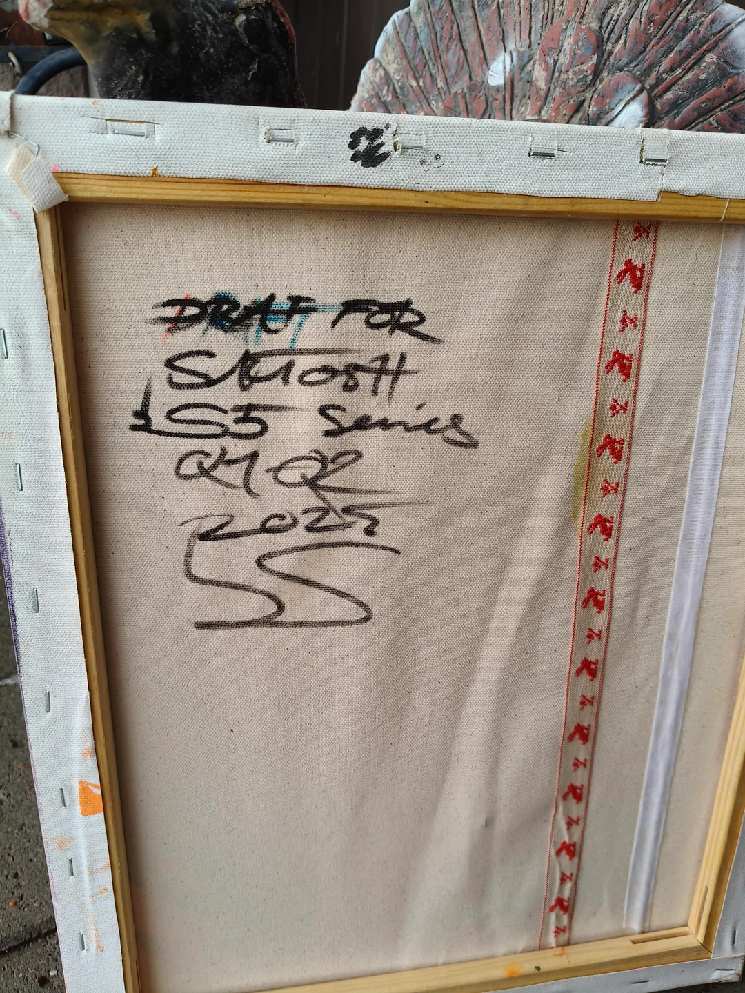 While creating Satoshi, the canvas developed a small tear. The work was then repainted on a new canvas with different dimensions, which is still not for sale.