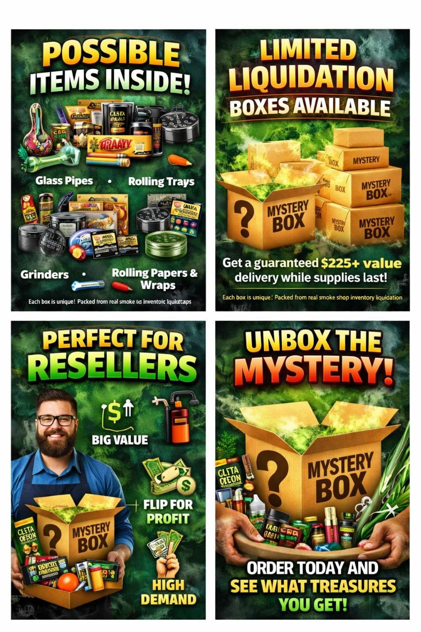 Tags: smoking pipe, mystery box, 420, cannabis, smoke shop, rolling trays, edibles, bong, banger, bow, liquidation, rolling paper, vape, stash jar, incense, meditation, gift