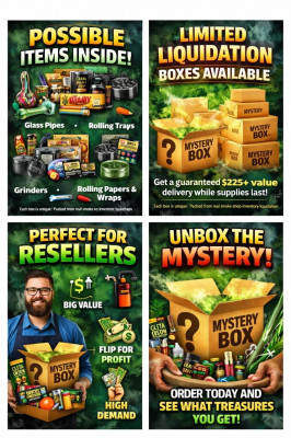 Each mystery box will have a value of at least $200. It can include anything that we sell in the shop. Pipes, tray, grinders, edibles and more. The selection will be nice and well worth your money.