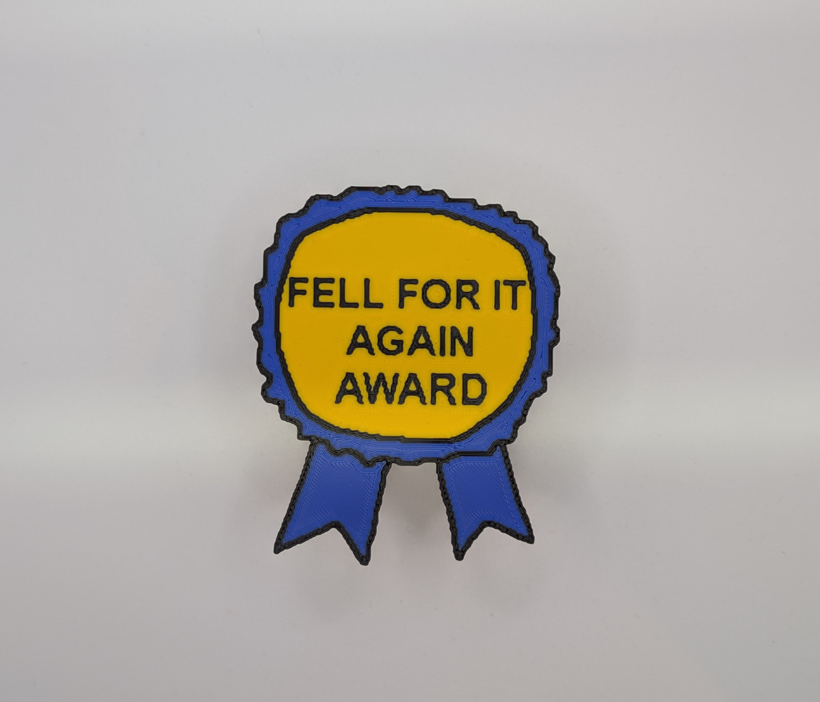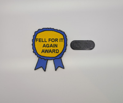 This is a 3D printed "Fell For It Again Award" magnet. It has a couple of embedded disk magnets and should stick to anything magnetic pretty well. Also comes with a small TPU backer (also with embedded disk magnets) that can be used to wear it on a shirt or something.