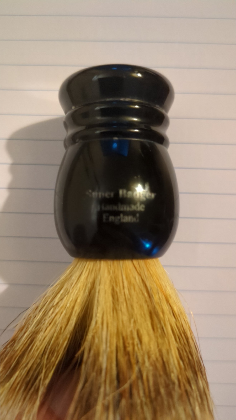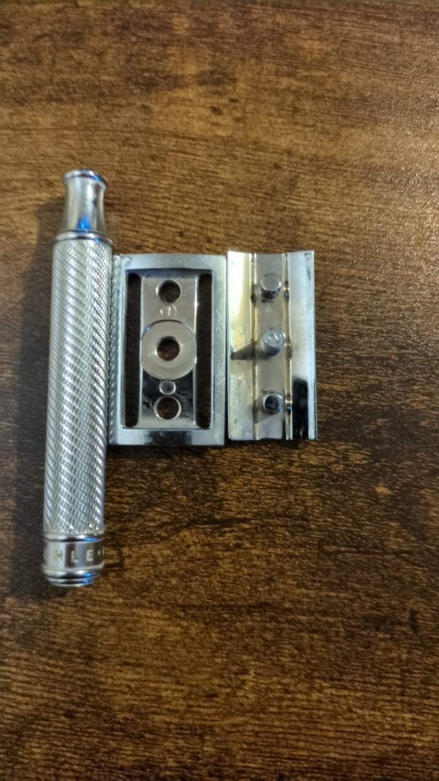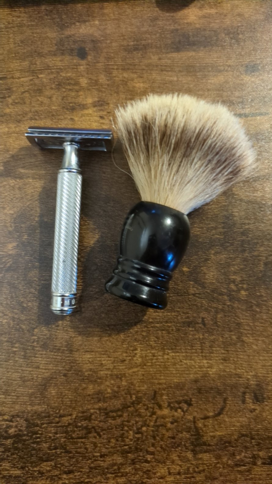 A safety razor made by the German brand Muhle. It is in excellent condition and has no rust or damage to it. It comes with a used "Super Badger" shaving brush made by Edwin Jagger and is hand made in England. The Edwin Jagger branding has been worn off over time.