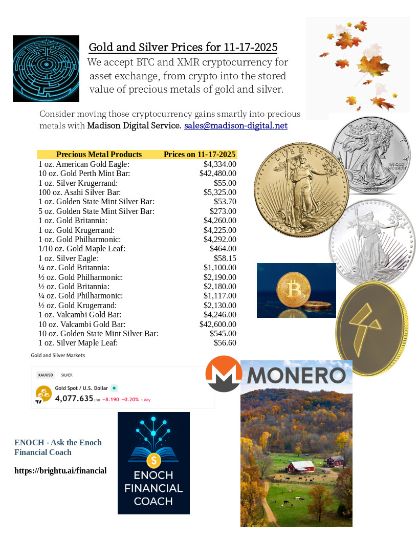 We offer BTC and XMR exchange for precious metals. We have a service that is a concierge experience for you to unload some of of crypto assets into precious metals. We feel our friends and community should diversity their wealth, so that no {other} man should know their wealth. Wealth is what to pass on to the next generation. Your responsibility is to earn, protect, grow, and keep it to to be free and self-determined. Precious Metals and XMR are the best possible combination in our view.