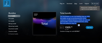 The Total Bundle is a set of all FabFilter plug-ins. With this bundle, you get our professional EQ, reverb, compressor, multiband dynamics, limiter, de-esser and gate/expander, creative multiband distortion, delay, filter and synthesizer plug-ins.