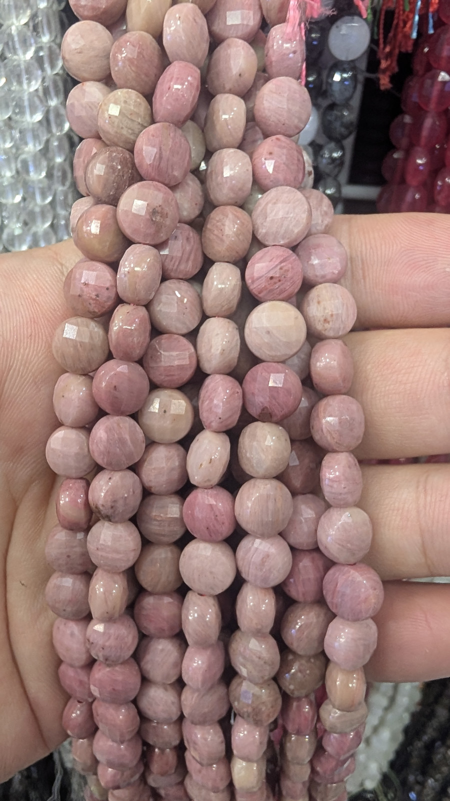 Tags: Wholesale, 8mm, Faceted, Rhodonite, Gemstone, Coin, Long, Strand