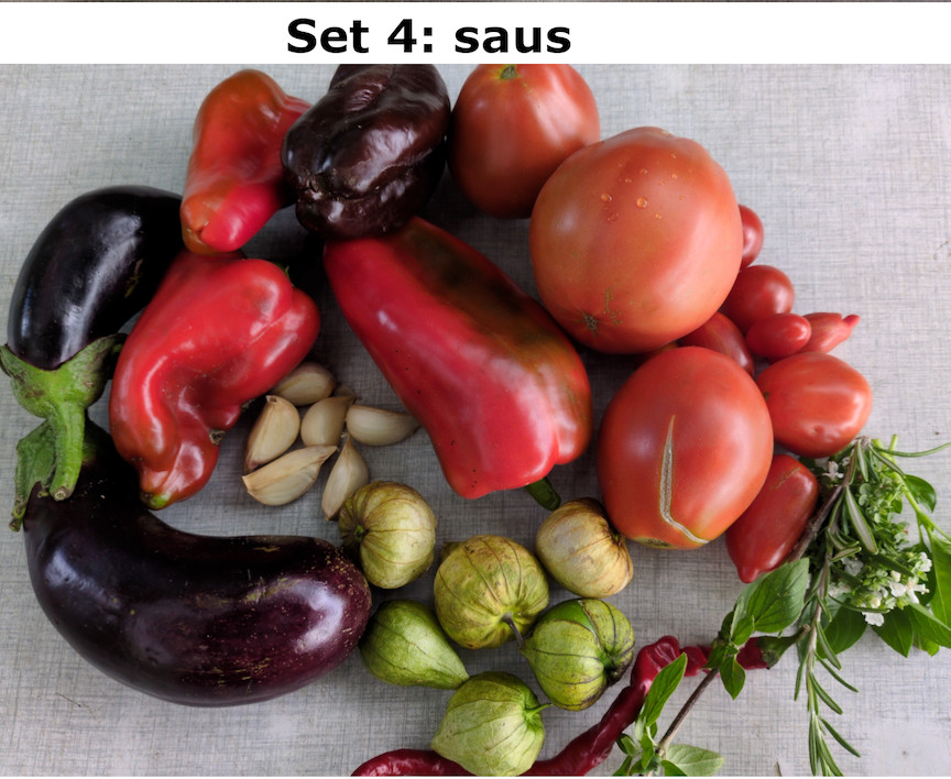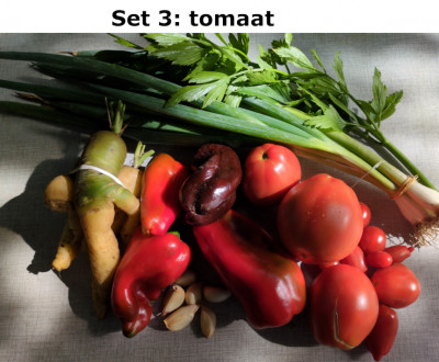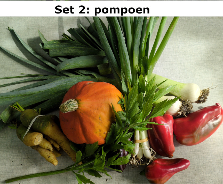 Tot 1 dec, 10 keer, wekeljks een assortiment, afhankelijk van onze oogst: paprika, tomaat, aubergine, één of ander seldergewas, stengeluien, prei, één of ander bladkoolgewas, wortelen of kruiden