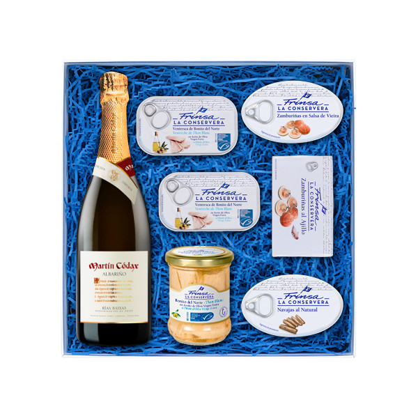 A refined Galician gift box featuring premium Frinsa seafood preserves paired with a bottle of Martín Códax sparkling Albariño.