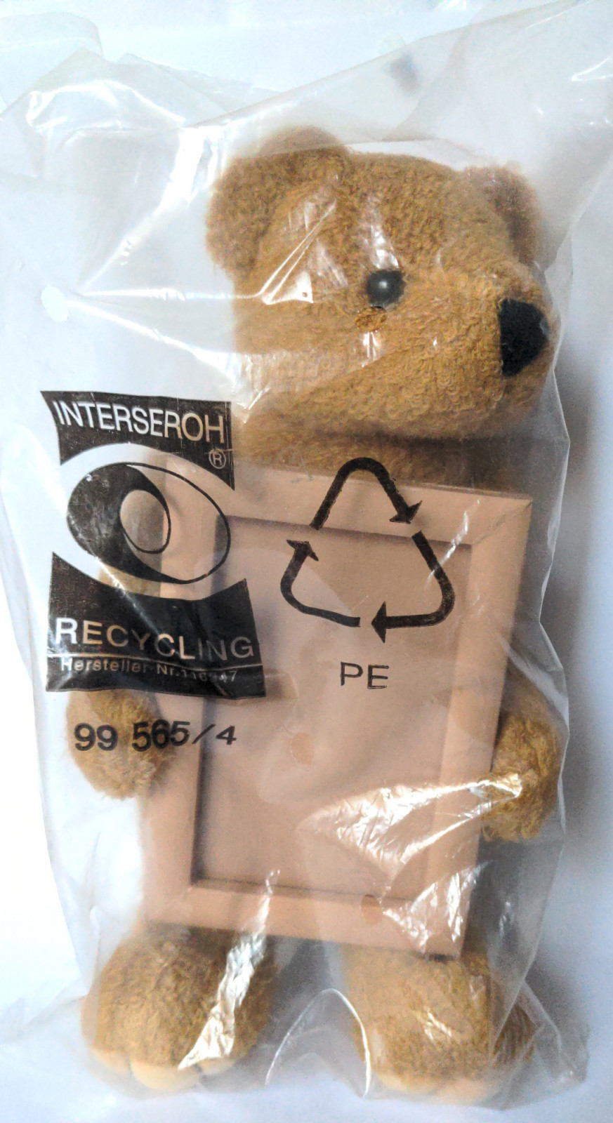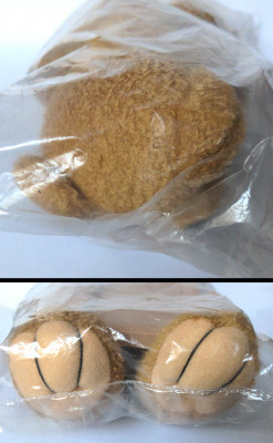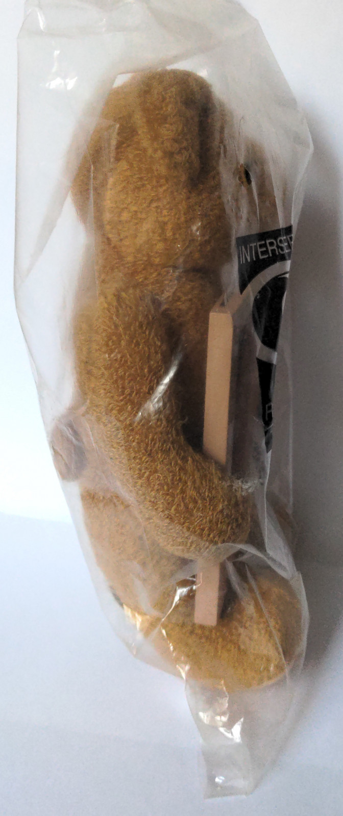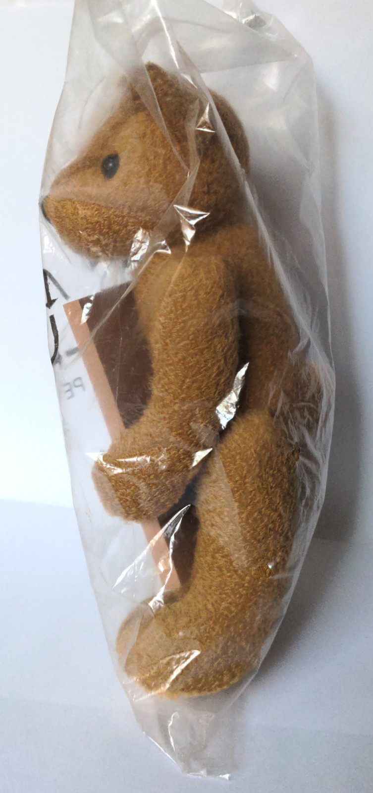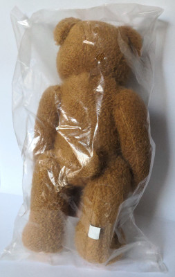 A brown toy bear holding a sign | Very good condition, original/unopened packaging