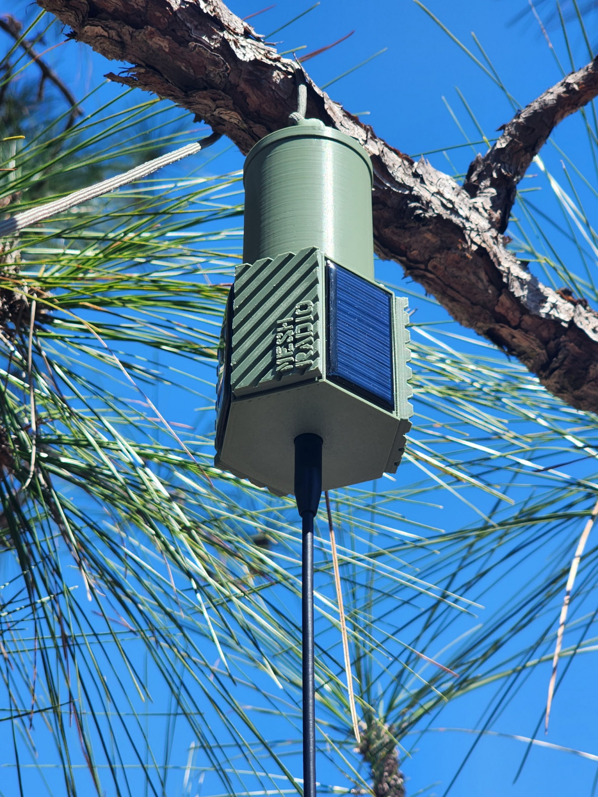Solar Mesh radio flashed with the latest version of Meshtastic. XIAO nRF52840 & Wio-SX1262 Kit for Meshtastic in a 3d printed case made to hang high in a tree or similar location.