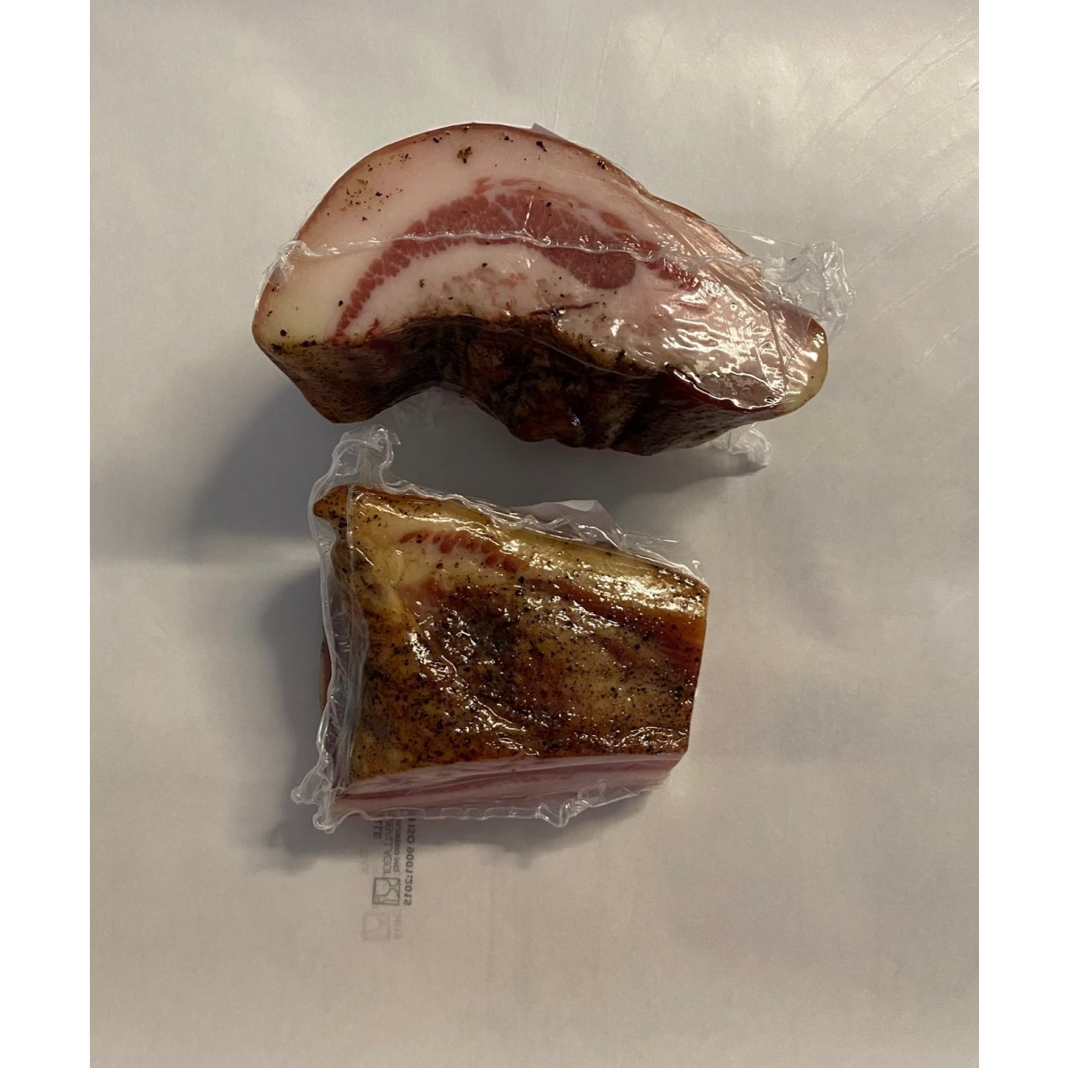 Traditional Italian Guanciale , cured, lightly smoked and seasoned following an old Ciociaro recipe. Aged for one year under and now under vacuum with a touch of chili — flavorful but not spicy inside. Around 500 g per piece (exact weight will be confirmed). Perfect for authentic carbonara or antipasto boards.