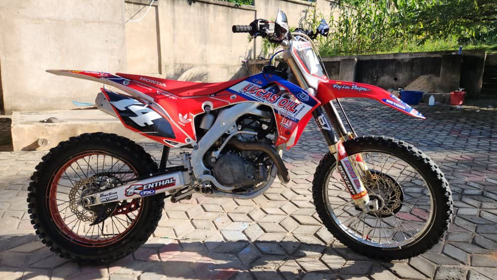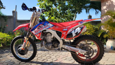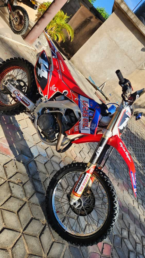 2014 Honda CRF450R motocross bike in excellent condition. The bike has been well maintained and runs very strong with smooth power delivery. Engine, suspension, and brakes are all in great working condition, and the bike starts easily with no mechanical issues. It has been serviced regularly and kept clean, with only normal wear expected from a motocross bike of this year.