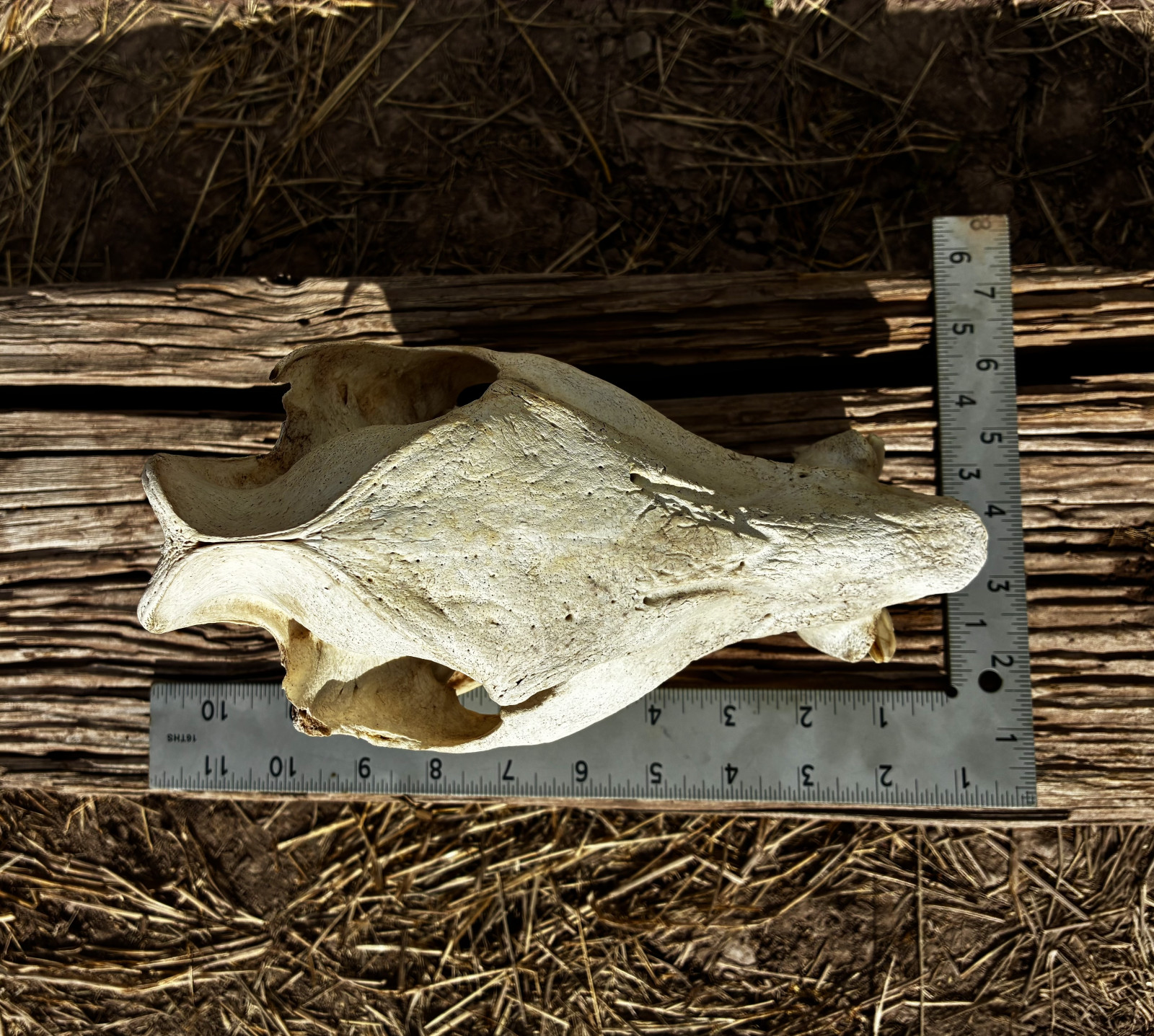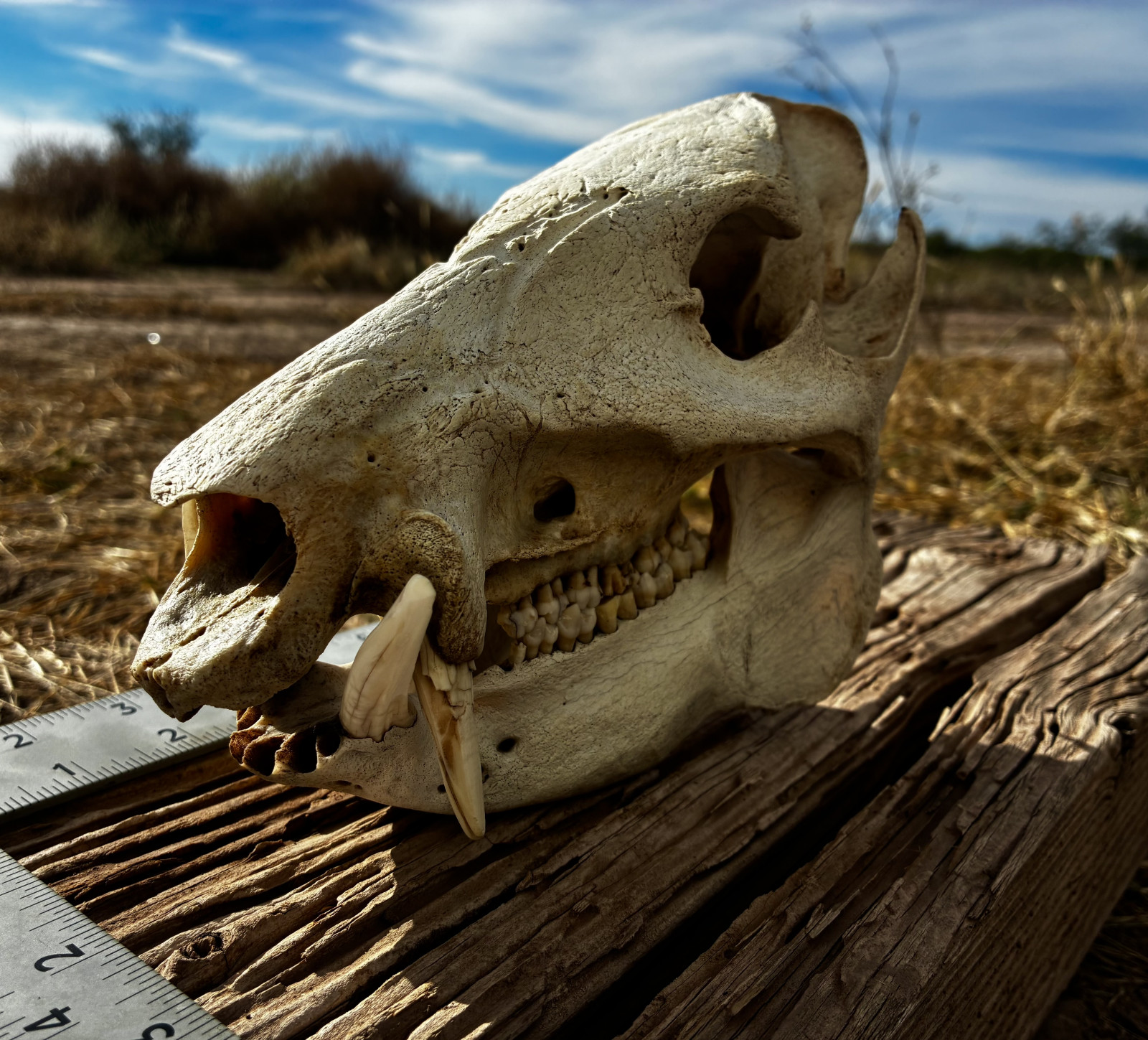 I found this skull on my land in southeastern Arizona, the front teeth and upper right tusk are missing. Free shipping within the United States, for other countries send me a message and I’ll figure out the cost.
