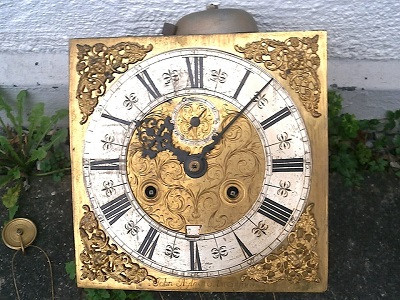 EARLY 1690 CLOCK DIAL+movement 11 inch sold as is in the photos in need or restoration as you see it in the photos PLEASE SEE PHOTOS TICKS AND STRIKES WITH PRESSURE ON THE GREAT WHEELS 8 DAY 11 INCH dial + movement ALL ORIGIANL TO EACH OTHER ITS BEEING SOLD FOR SPARES OR REPAIR THE BELL HAMMER STEM NEEDS A EPAIR I HAVE HAD THIS TICKING