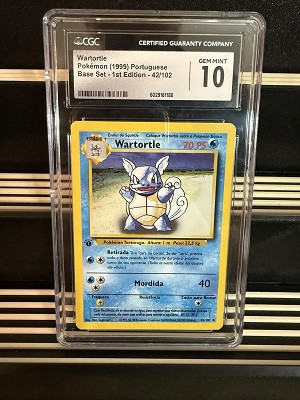 The product is a Pokémon Wartortle card from the Base Set 1st Edition, Portuguese version, released in 1999 by The Pokémon Company. This graded card has received a perfect grade of 10 from Certified Guaranty Company (CGC), making it a valuable collector's item for fans of the Pokémon TCG franchise. The card features Wartortle, an uncommon vintage Pokémon character, on standard-sized card stock with a regular finish. This rare and highly sought-after card is a must-have for any Pokémon card enthusiast looking to add a unique and special piece to their collection.