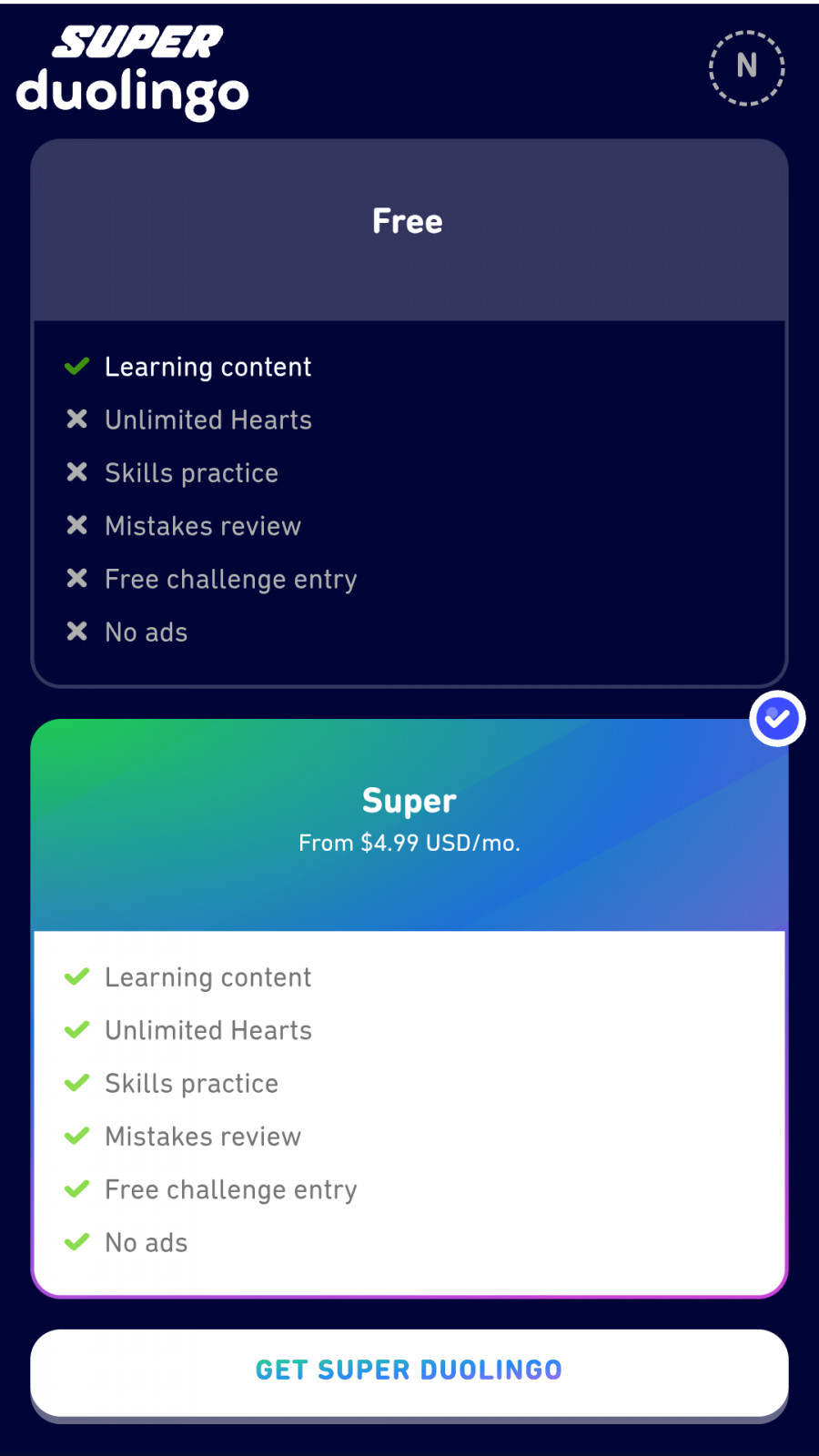 Step up your language learning game with a Duolingo Super membership! No more ads, Unlimited hearts, Personalized practice, and free Legendary challenges!