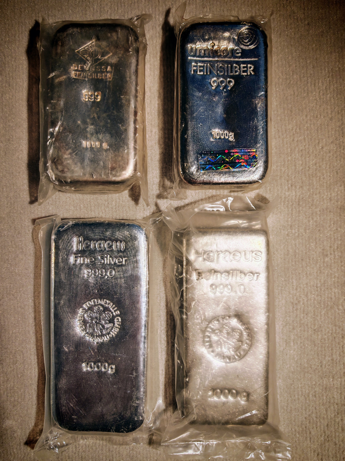Genuine 1 kilogram .999 fine silver bars from well-known European refiners (see photos). Classic stacker bars.