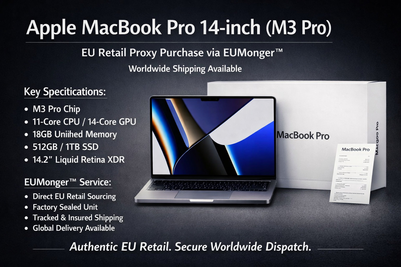 EUMonger™ operates strictly as a proxy purchaser. Upon confirmed request, the selected configuration is acquired from an authorized Apple Store or approved EU retailer and prepared for secure delivery — within Europe or worldwide.