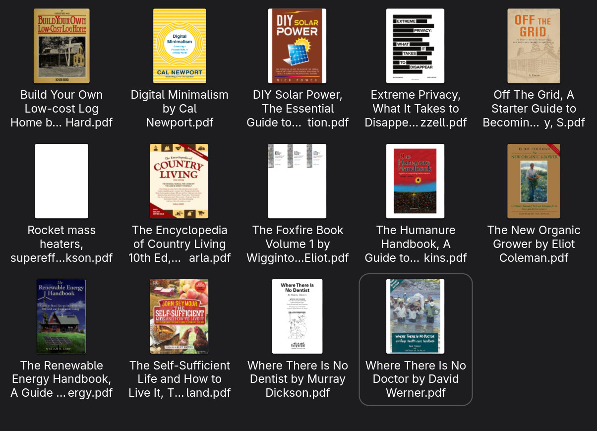 I went down a rabbit hole a while ago about off grid living and relying the bare minimum on society and I looked around reddit and other forums for some cool related books I could read through, I have found these couple books. Realistically you could get these yourself for free with a bit of scouring on your end, I just provide a more convenient way to get it and in the proccess you help support a broke student.)