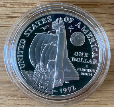 UNITED STATES OF AMERICA ONE DOLLAR E PLURIBUS UNUM 1492-1992, The Santa Maria ship sailing right and the space shuttle Discovery combined with a moon in the background.