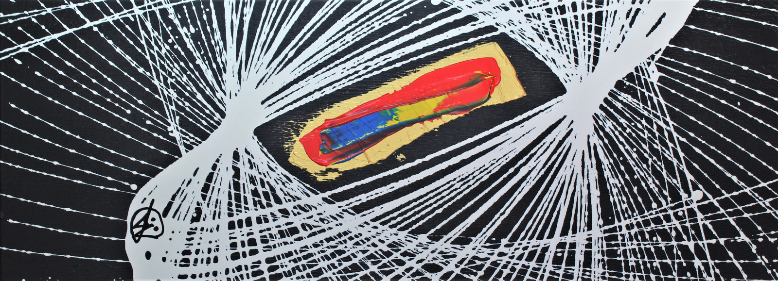 At the center, a bold golden rectangle frames a vibrant, fluid burst of color — flowing intensely from fiery red through yellow and green into electric blue.