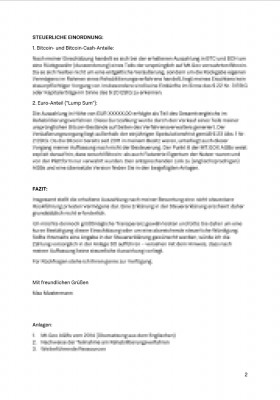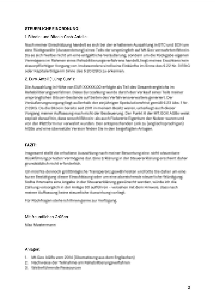 The reasoning outlined in this document successfully led to the MtGox income (the lump sum, BTC, and BTH amounts) being classified as tax-free by the German tax office. It was developed together with two professional tax lawyers for a fee of over €2,100.
