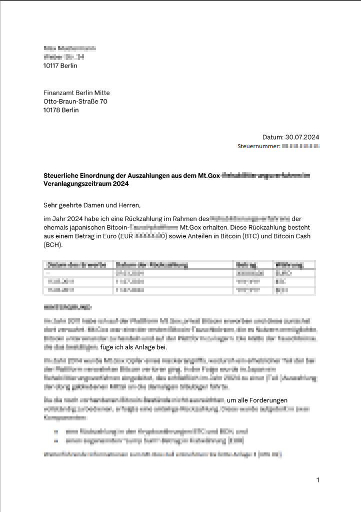 im Jahr 2024 habe ich eine Rückzahlung im Rahmen des Rehabilitierungsverfahrens der ehemals japanischen Bitcoin-Tauschplattform Mt.Gox erhalten. Diese Rückzahlung besteht aus einem Betrag in Euro (EUR XXXXX,00) sowie Anteilen in Bitcoin (BTC) und Bitcoin Cash (BCH)..."
