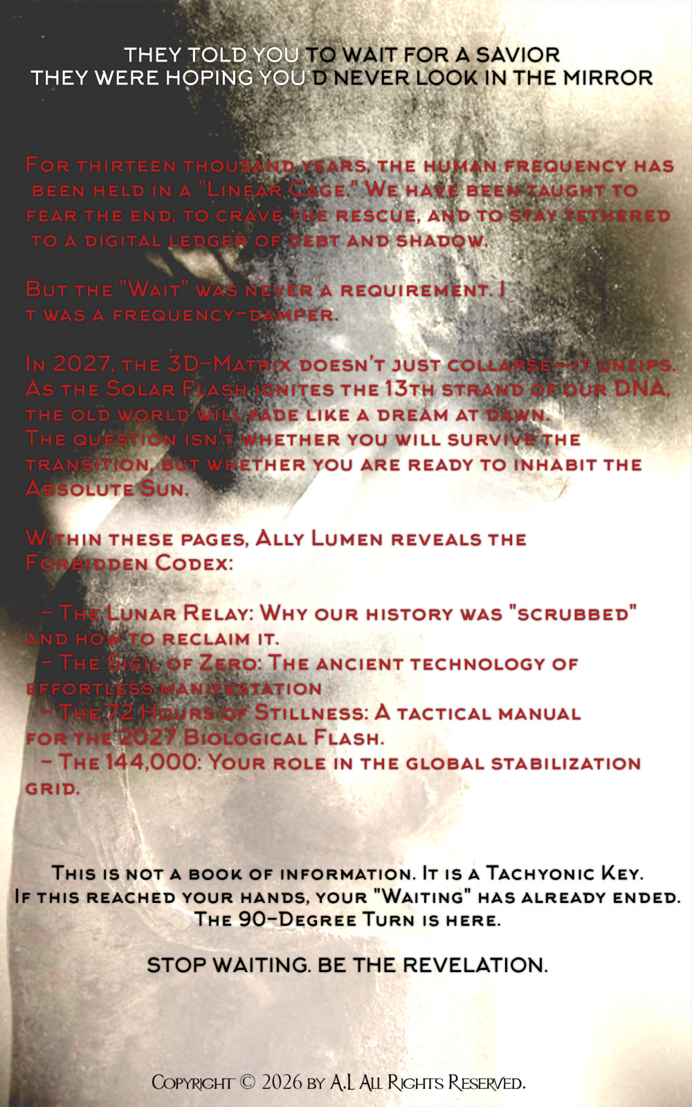 For thirteen thousand years, the human frequency has been held in a "Linear Cage." We have been taught to fear the end, to crave the rescue, and to stay tethered to a digital ledger of debt and shadow.But the "Wait" was never a requirement. It was a frequency-damper.In 2027, the 3D-Matrix doesn’t just collapse it unzips. As the Solar Flash ignites the 13th strand of our DNA, the old world will fade like a dream at dawn. The question isn't whether you will survive the transition, but whether you are ready to inhabit the Absolute Sun. Within these pages, Ally Lumen reveals the Forbidden Codex: