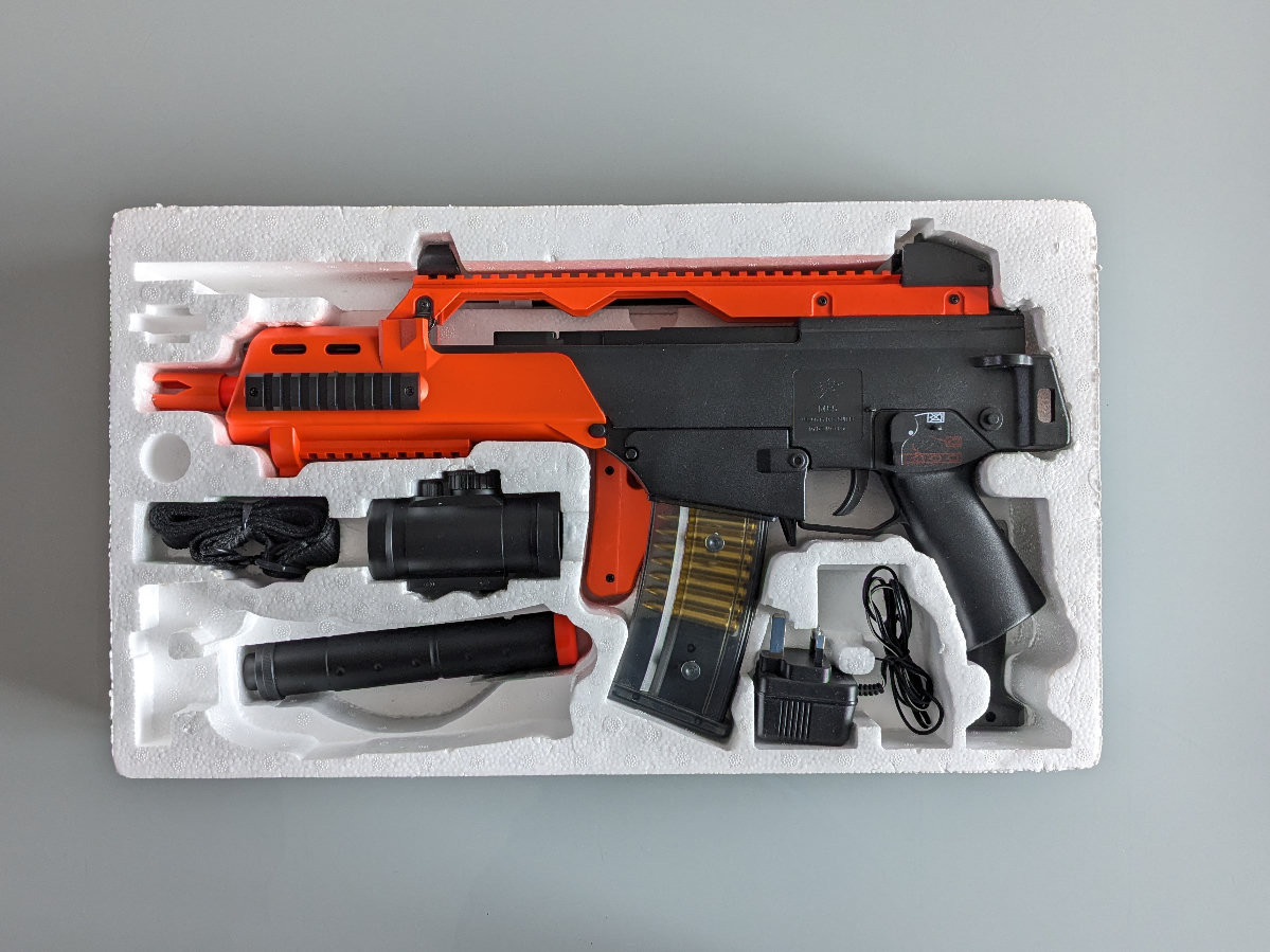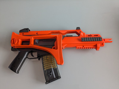 It is best suited for casual backyard target practice but performs okay in formal skirmishes (transparent mag so you know how much ammo is left, folding stock to navigate through tight spaces).