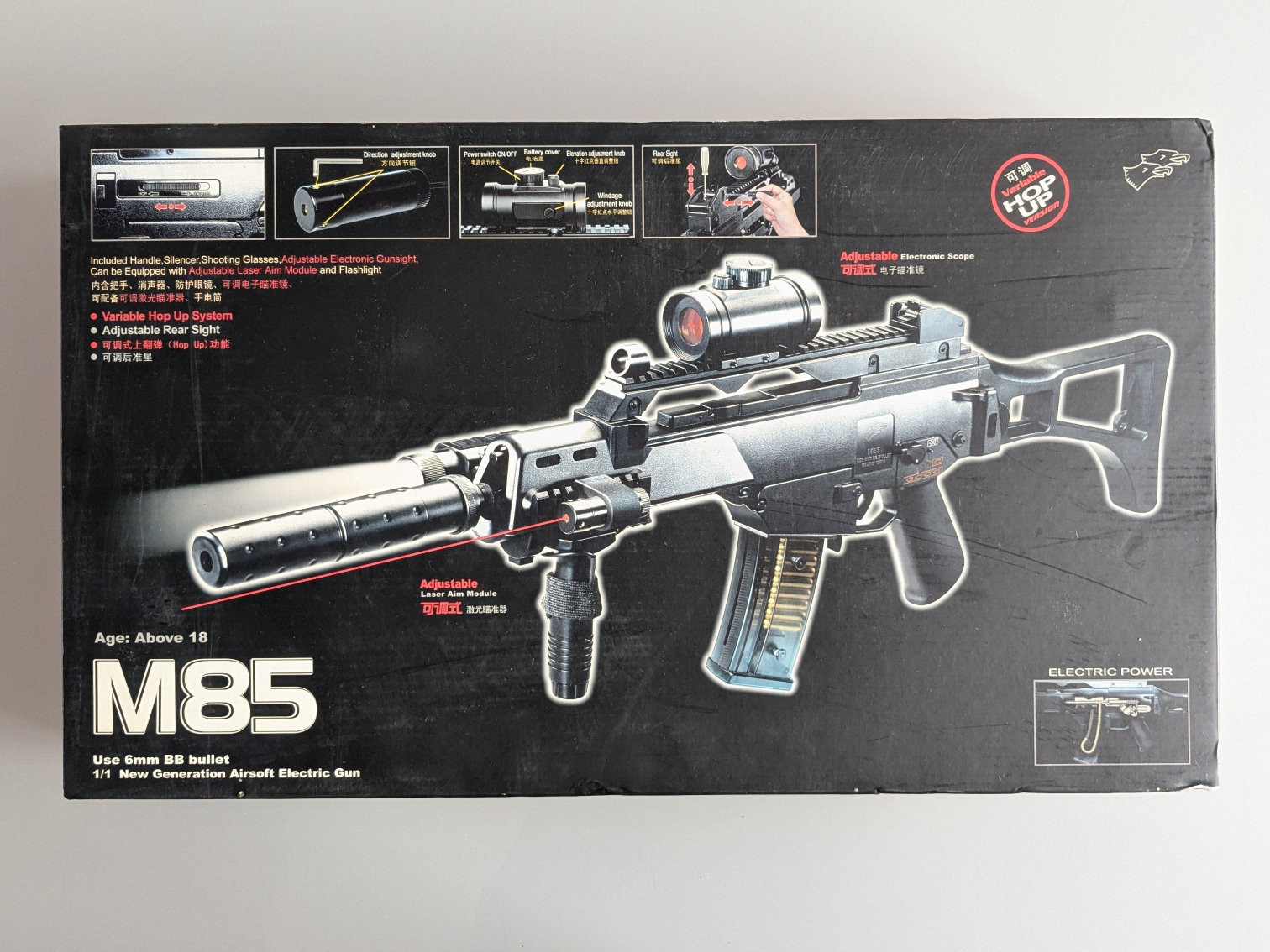 This is an excellent entry-level choice for players seeking a realistic, high-performance gun with either semi-automatic or full auto firing modes. Comes with shoulder strap, red dot scope, rechargeable battery and AC adapter, and a mock silencer.
