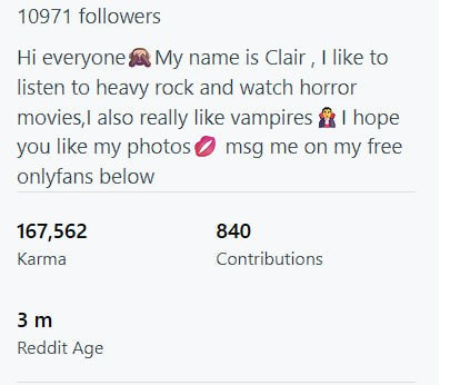 11K followers 168K karma 900+ NSFW posting history 3 months old