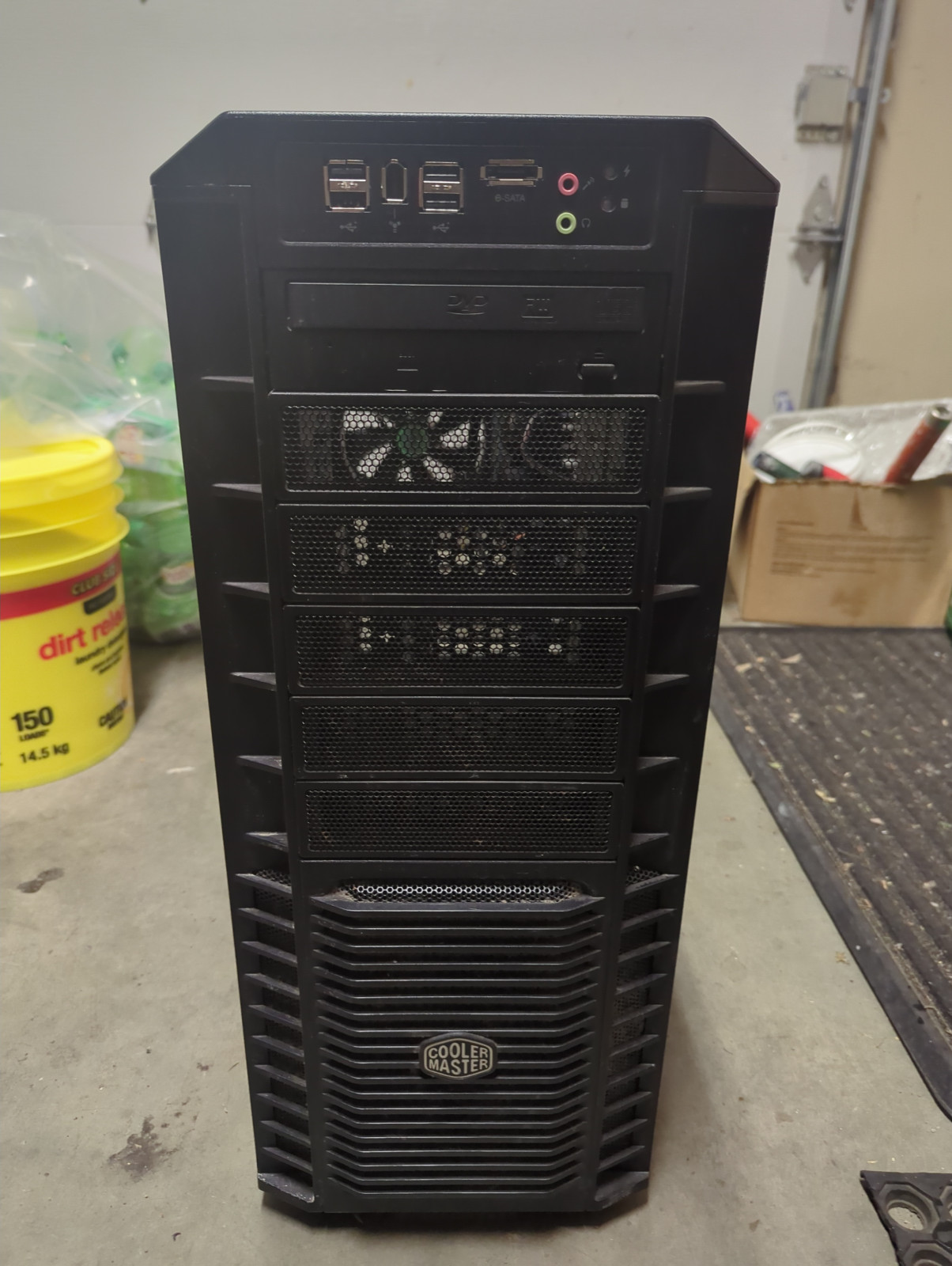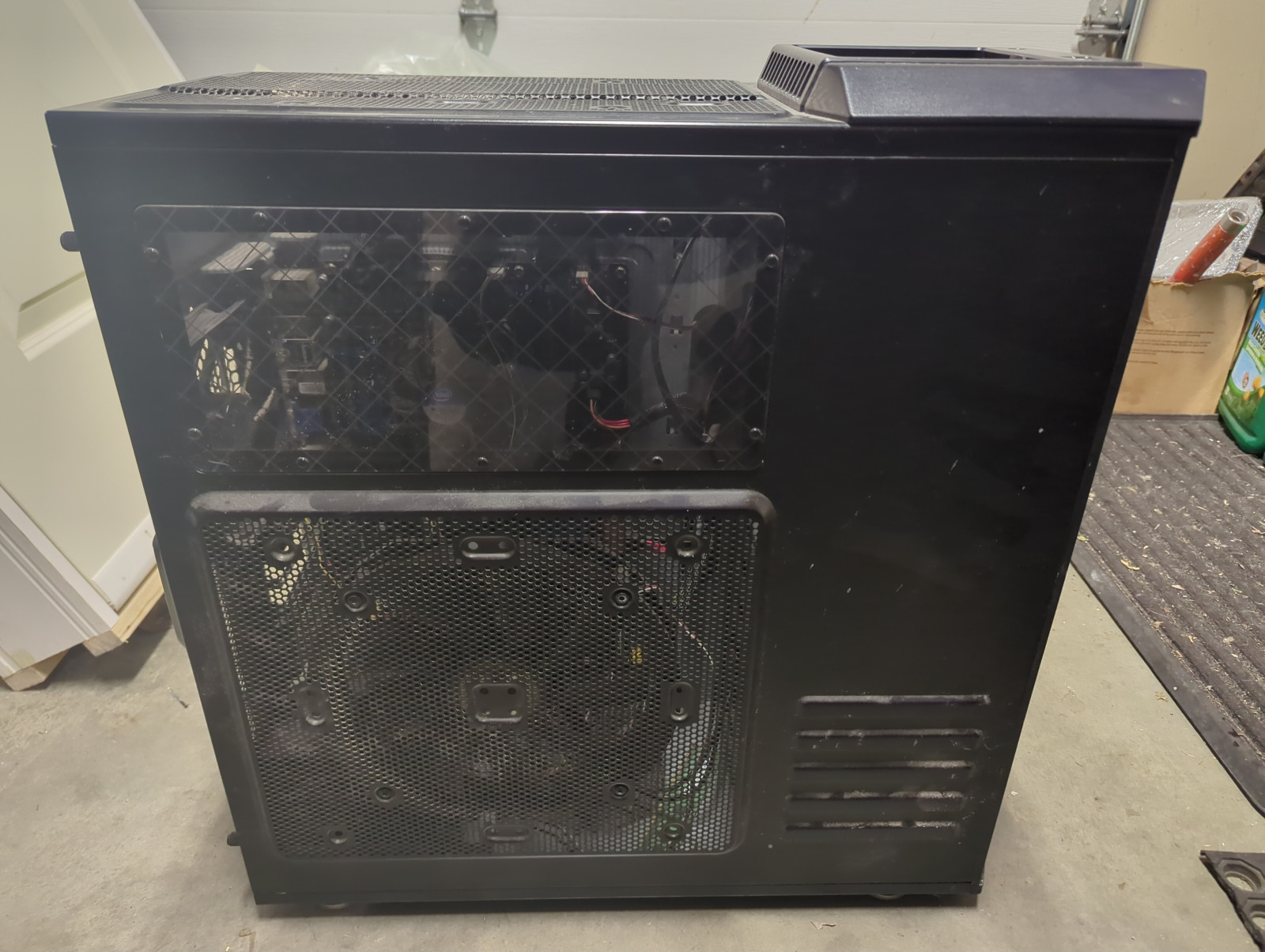 Cooler Master case with fans, 3000 series intel motherboard (unknown if it works) and misc parts