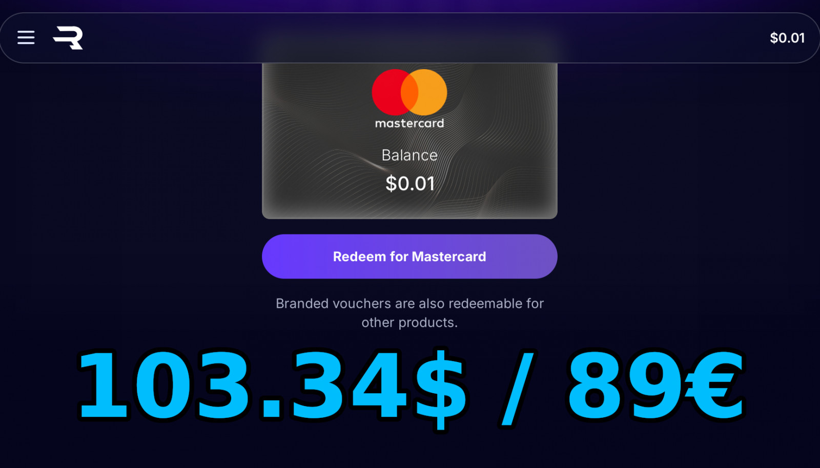 NoFee 103.34$/89€ Redeemed Rewarble/Mastercard 3DS Global Anonymous