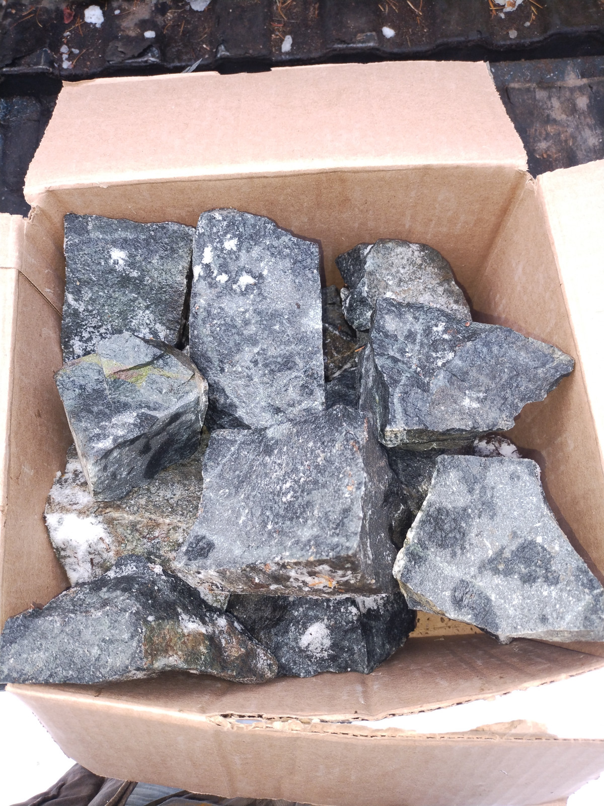 Premium BC gabbro rocks for your sauna stove. Excellent thermal qualities combined with durability for heat makes gabbro a superb choice. You get about 45kg per order, which is a heaping 5 gl bucketful. Enough for all but the biggest stoves. Ships in 2 boxes, shipping cost on a per order basis.