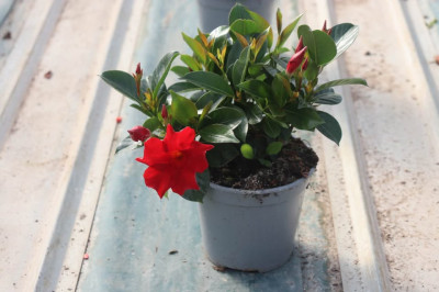 Set of 6 Dipladenia (Mandevilla) plants in a beautiful mix of red, pink, and white. These elegant flowering plants are perfect for adding a tropical touch to balconies, terraces, and outdoor spaces.